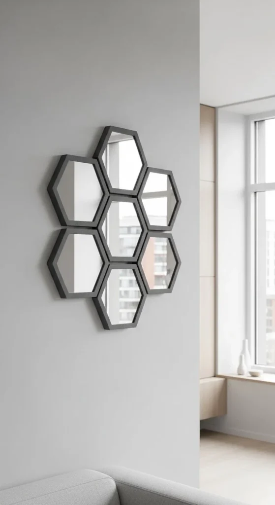 Hexagon mirrors create a structured modern mirror gallery. Cut foam board hexagons to fit around each mirror precisely. Hot glue works well for quick assembly. Paint all pieces for a unified look. Arrange in honeycomb patterns above consoles, desks, or beds. Neutral colors keep the design cohesive. Lightweight materials simplify hanging and adjustments. Use consistent spacing for symmetry. Mirrors reflect light and make small spaces appear larger. Pair with minimal furniture to let shapes stand out. This DIY is beginner-friendly and budget-conscious. Try mixing sizes for visual interest. Matte finishes reduce glare. The geometric arrangement adds depth without heavy construction. Perfect for apartments or rented spaces where wall damage should be minimized.