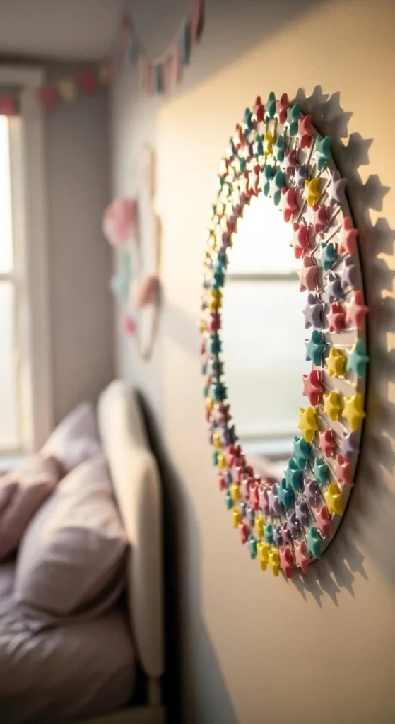 Resin accents add sparkle and playful detail. Place stars around the mirror perimeter before securing with clear resin or glue. Glamorous mirror DIYs shine in bedrooms or creative studios. Keep surrounding decor minimal to emphasize burst patterns. Resin provides depth and subtle reflection. Use lightweight mirrors to avoid wall strain. Colors can complement a room palette. Painter’s tape keeps glass clean during work. Allow full curing before hanging. Layer stars in clusters for dimension. Soft lighting enhances reflective surfaces. Resin starbursts are beginner-friendly and transform simple mirrors into whimsical focal points.