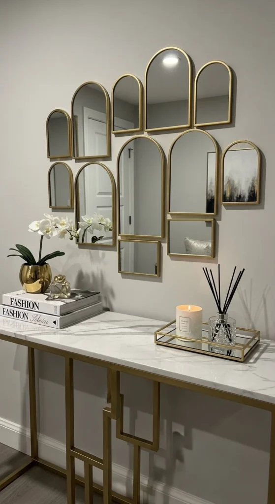 Arched mirrors create movement and rhythm on flat walls. Mount all mirrors on a single backing for easier hanging. Dry-fit mirrors to keep spacing consistent. Paint frames after assembly for uniformity. Gallery wall mirror clusters look stunning in dining areas, stairwells, or hallways. Neutral or metallic finishes let reflections shine. Low furniture ensures mirrors remain the focus. Clusters mimic high-end installations on a tight budget. Soft lighting enhances reflective surfaces without glare. Arches complement straight lines in furniture or trim. Use foam board or lightweight paneling for stability. Hanging one large panel reduces wall damage and simplifies leveling. Repeat arched shapes for cohesion or mix small sizes for visual interest. Keep surrounding wall decor minimal so shapes stand out. Reflections enlarge perceived space and light. This approach turns ordinary mirrors into eye-catching focal points with minimal cost. The DIY process is beginner-friendly and fast, making it perfect for quick room updates.