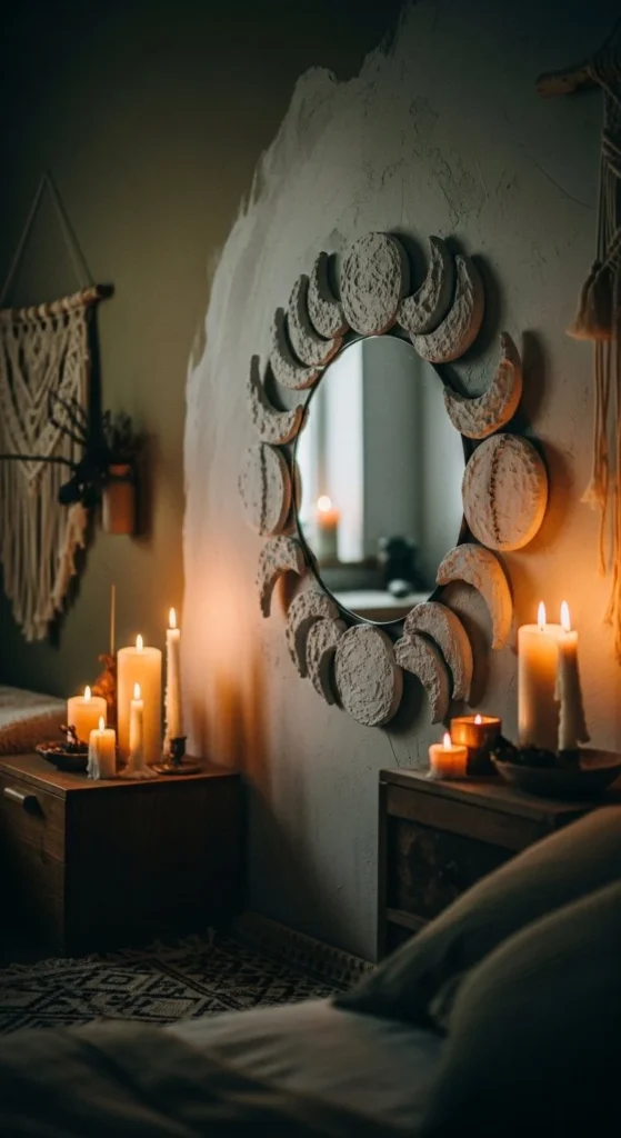 Spackle adds texture for mystical mirror DIYs. Apply phases with a palette knife in raised patterns. Sand lightly before painting. Paint in muted tones to highlight shadows. Soft candlelight or ambient lighting brings out texture. Works in bedrooms, meditation corners, or studios. Use painter’s tape to protect mirror edges. Moon phases can be full, crescent, or mixed. Let the spackle cure fully to avoid cracks. Minimal furniture ensures the mirror dominates the wall. Neutral walls increase contrast. Lightweight mirrors can be mounted with standard anchors. Combine with natural decor like plants or textiles. This creates a whimsical, tactile focal point with low-cost materials. Soft finishes emphasize boho charm while maintaining elegance.