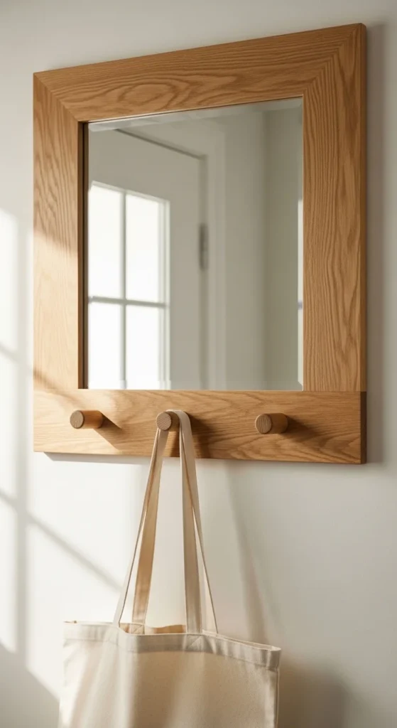 Keep the frame simple so hooks feel intentional. Natural wood or light stain works well. Seal everything since hooks see wear. This mirror fits entryways where bags, hats, or scarves get daily use.