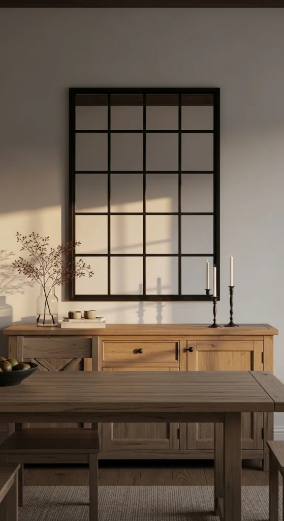 Style it with a narrow table, crock with stems, or stacked books. This design works well in entryways and dining rooms where straight lines feel grounding. It also pairs nicely with black iron hooks or a simple bench nearby.