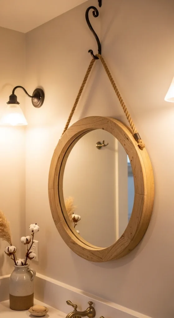 Rope hangers bring casual charm. Use thick cotton or jute rope rated for weight. Tie secure knots and test before hanging. The mirror frame should be lightweight but sturdy.