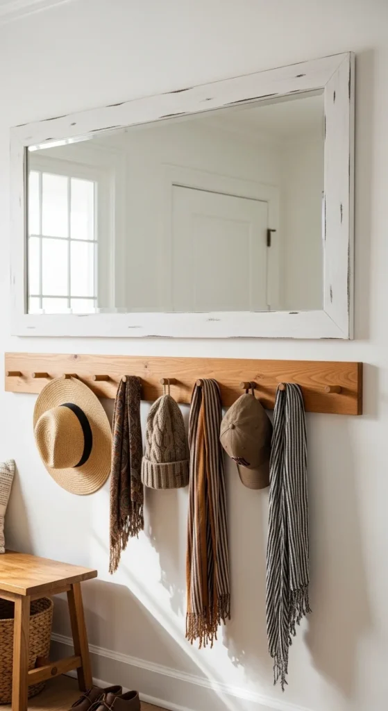 DIY shortcut: buy wooden pegs online and cut them shorter for a custom look. Keep styling light. One bag per hook looks better than crowding. This design blends utility with farmhouse warmth in a clean way.
