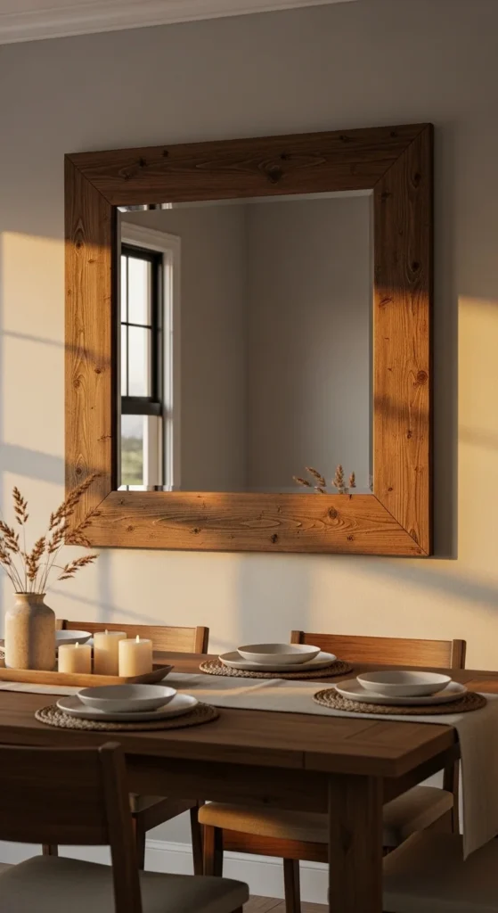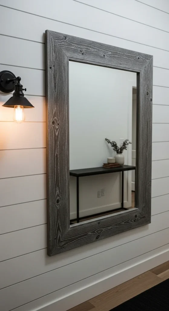 This mirror style leans into texture first. Old fence boards or barn planks work well because the grain already tells a story. Cut four boards with simple square edges. Skip ornate cuts. Let the wood do the talking. Light sanding keeps splinters away without erasing marks. For color, clear matte sealer keeps tones honest. Dark wax adds age if boards feel too raw.