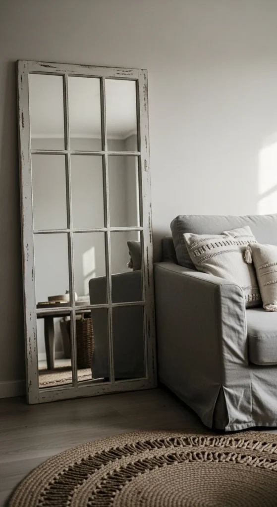 Old window frames make mirrors feel collected over time. Look for frames with divided muntins. Glass can be replaced pane by pane, which keeps costs lower. Clean the wood first. Then add a light chalk-style paint wash. Sand corners so wood peeks through.