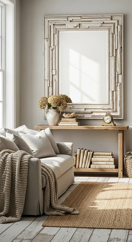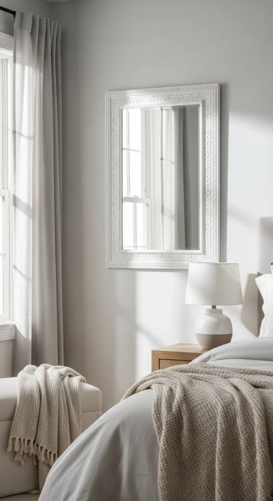 This mirror works in hallways or bedrooms where quiet tones feel right. Keep decor minimal so the finish stays the focus.