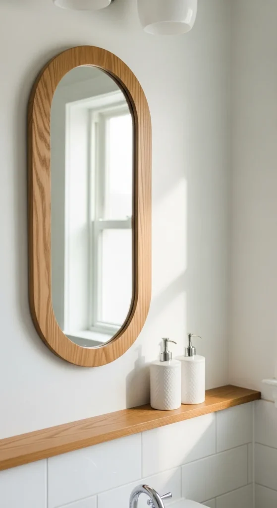 Seal the wood well, especially in bathrooms. A satin finish handles moisture without glare. For tight budgets, use a prefab oval mirror and attach a separate ledge underneath rather than building a full frame.