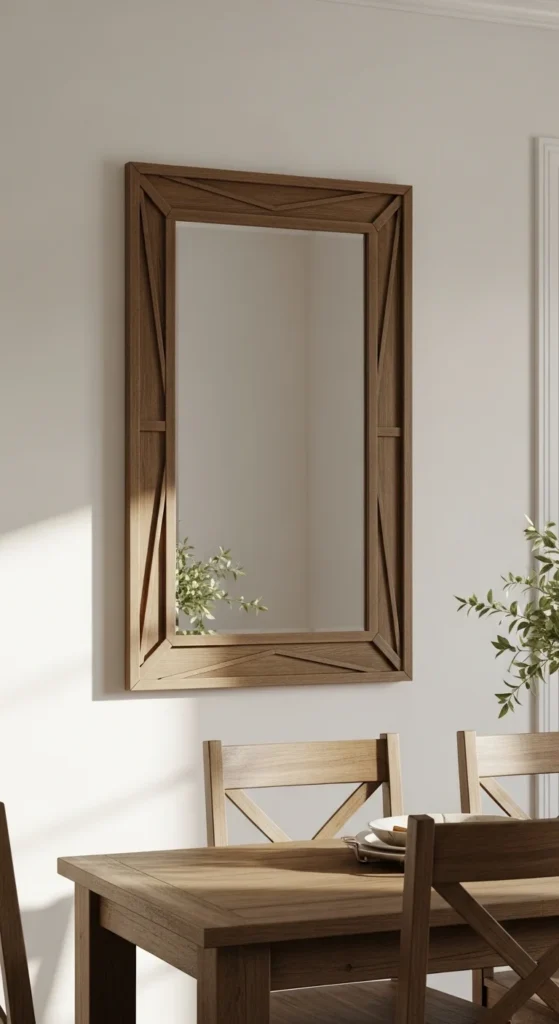 Cross braces nod to barn doors without going literal. Use thin wood strips arranged in an X or window-cross pattern. Attach them to the mirror surface with mirror-safe adhesive.