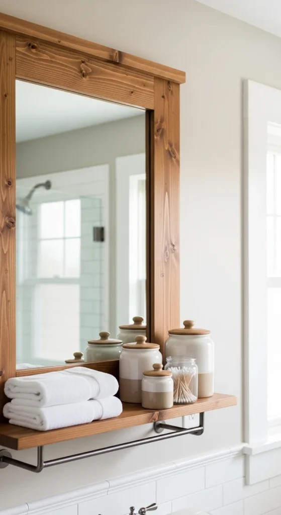 Budget tip: Use a builder-grade mirror and frame it yourself. The shelf hides edges and adds purpose. Style with only a few items. A small plant. One jar. Maybe folded linens. Too much clutter pulls attention away from the mirror itself.