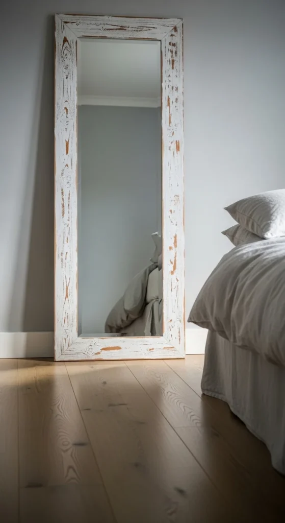 A tall leaner mirror makes rooms feel taller. Secure it with wall anchors for safety. Keep surrounding decor simple. Texture over color keeps the look grounded. Think linen, wool, raw wood. This mirror fits bedrooms and dressing areas where calm matters more than contrast.