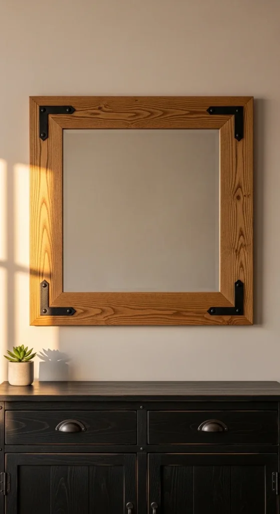 This mirror borrows its look from classic barn doors. The sliding rail becomes part of the design. Use a solid wood frame so it holds weight without flexing. Pine or poplar works well. Stain it darker than the wall for contrast.