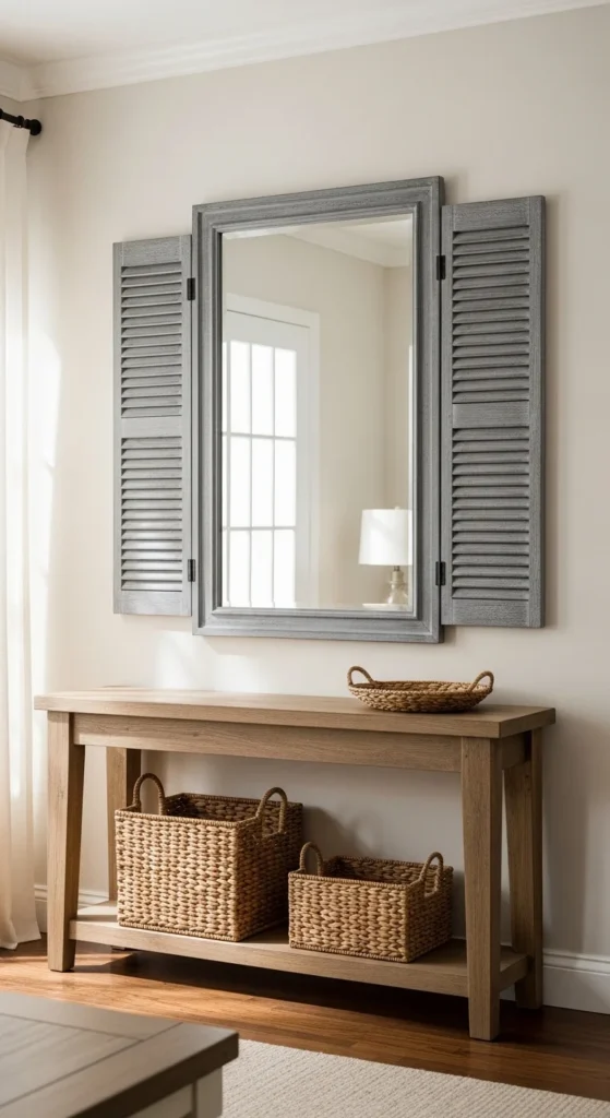 Paint them before mounting. Muted gray, soft sage, or worn white fit well. Light sanding on edges adds age. Keep the mirror plain so shutters stay the star.
