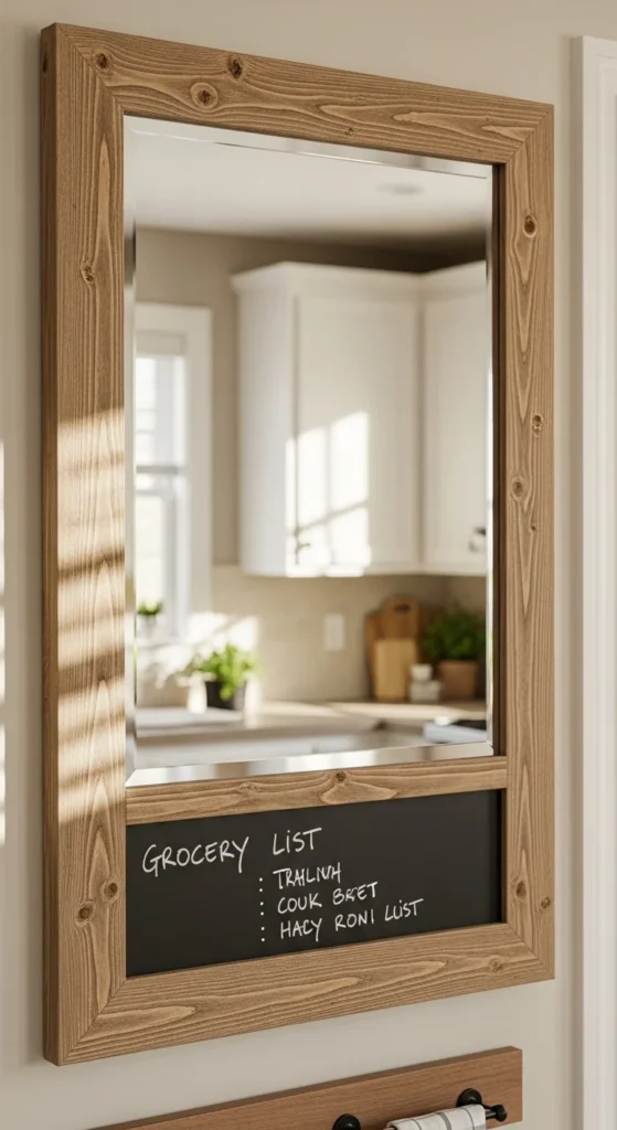 Adding a chalkboard strip turns a mirror into a message center. Use chalkboard paint on a thin MDF panel and attach it below the mirror within the same frame. Keep proportions tight so it doesn’t feel bulky.