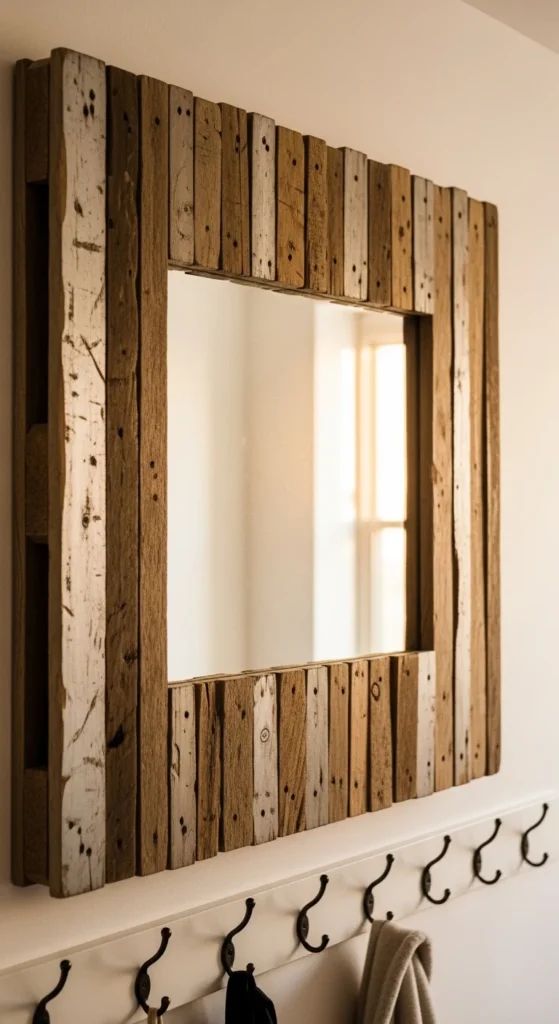 This mirror works best in casual spaces like hallways or mudrooms. Use heavy-duty hangers since pallet wood adds weight. Pair it with simple hooks or benches. Texture carries the design, so keep accessories minimal.