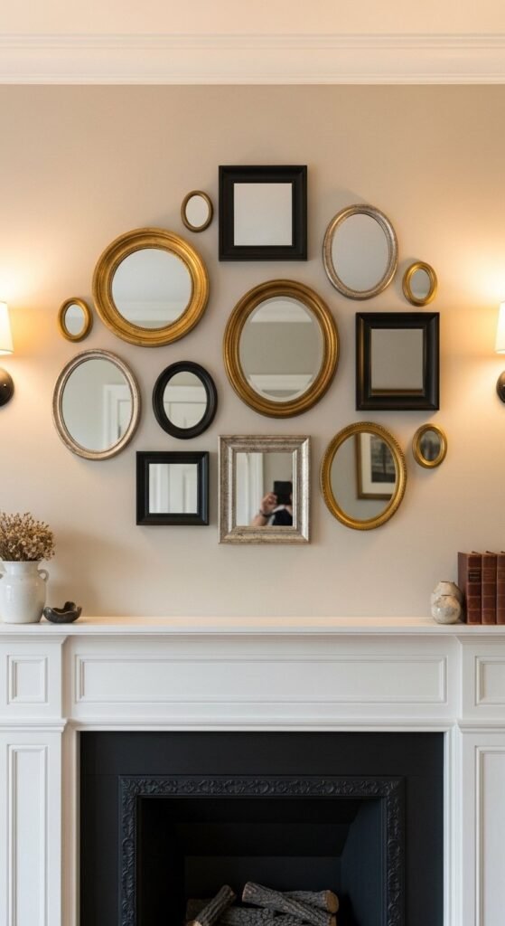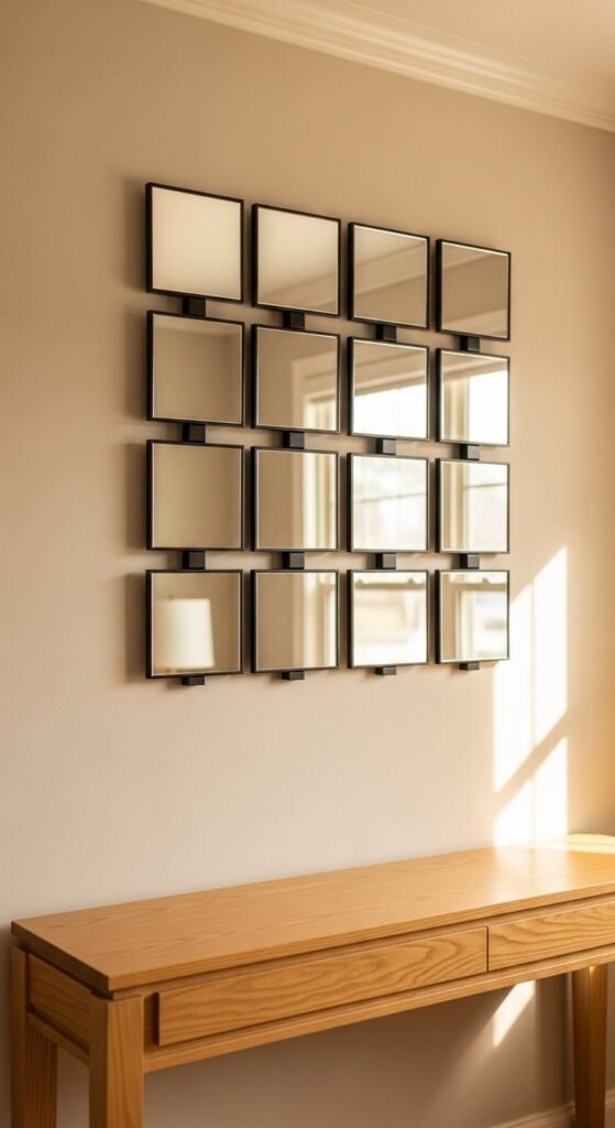 Small mirrors grouped together expand visual space. Mix round and rectangular shapes for rhythm. Keep spacing consistent so the wall feels organized. Lightweight frames hang easily. Odd numbers feel more natural in clusters. This layout suits living rooms and dining areas. Stick to one color family for cohesion. Step back often during layout to check balance before hanging.
