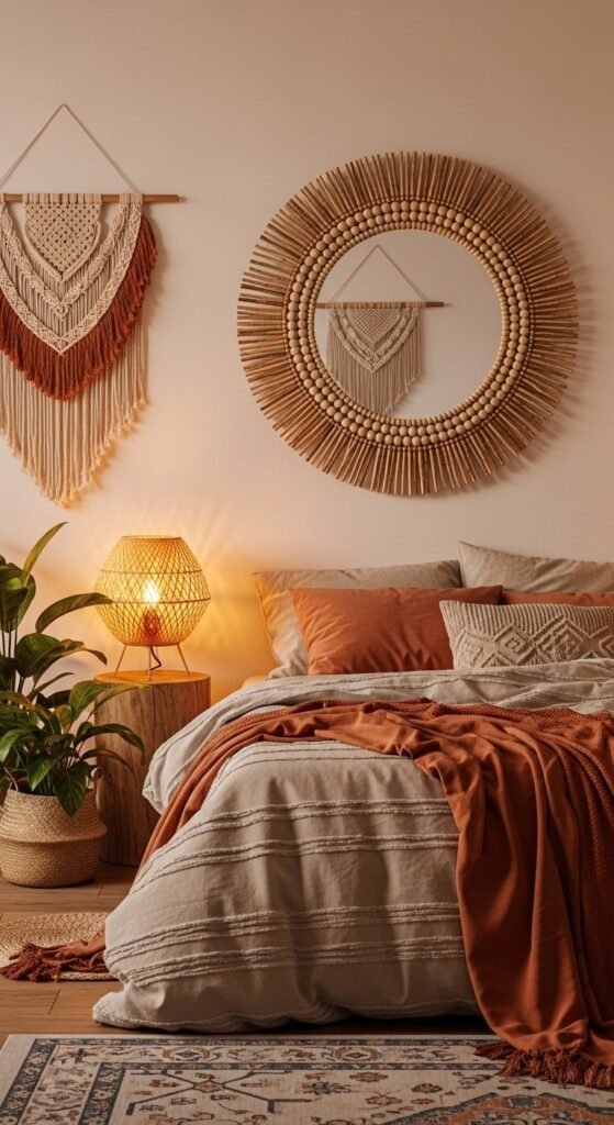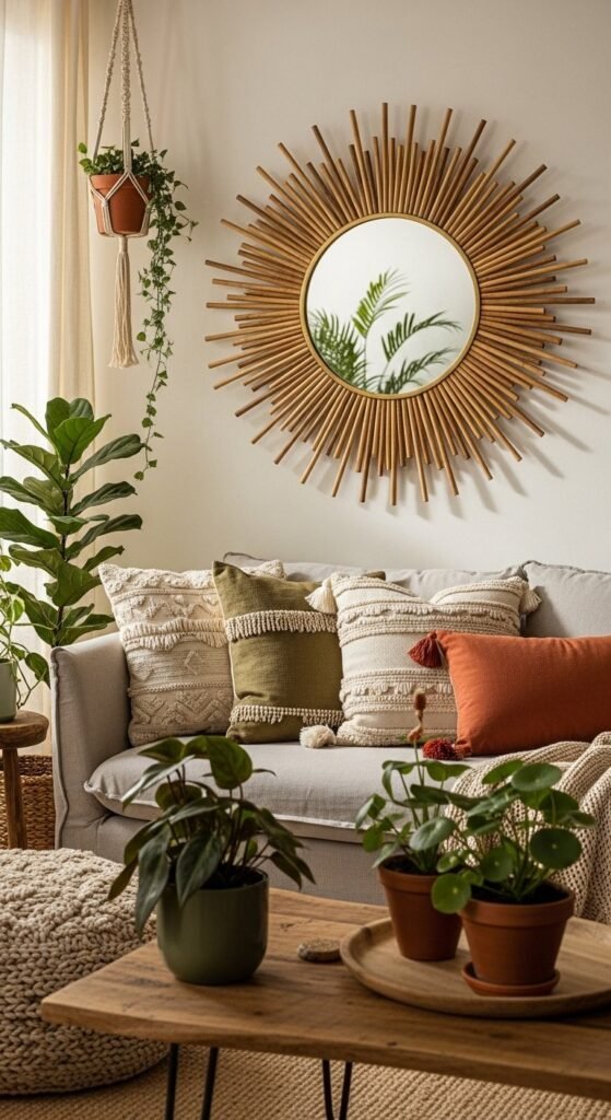 Sunburst mirrors lean retro but still feel current when paired with natural textures. Wooden skewers, craft sticks, or thin shims work well. Lay everything out before gluing so spacing stays balanced. Paint before assembly to avoid drips on glass. Gold spray paint adds instant drama, while raw wood keeps it casual. Foam board backing helps hold the radial shape steady. Hang this piece where light hits it directly so shadows show off the texture. Bedrooms, hallways, and above dressers work especially well. If symmetry feels intimidating, slightly uneven spacing gives it an artsy look instead of a stiff one.