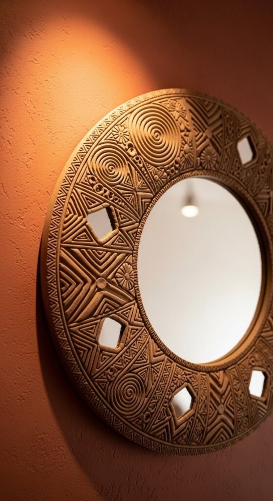Lippan frames blend texture and shine. Use air-dry clay to build raised patterns around the mirror. Press small mirrors gently into the clay while it’s soft. Let everything cure before painting. White or clay-toned paint highlights detail. Symmetry keeps the design grounded, even with ornate patterns. This piece works as wall art more than utility. Living rooms and accent walls suit it well. Keep surrounding decor understated so craftsmanship stays front and center.