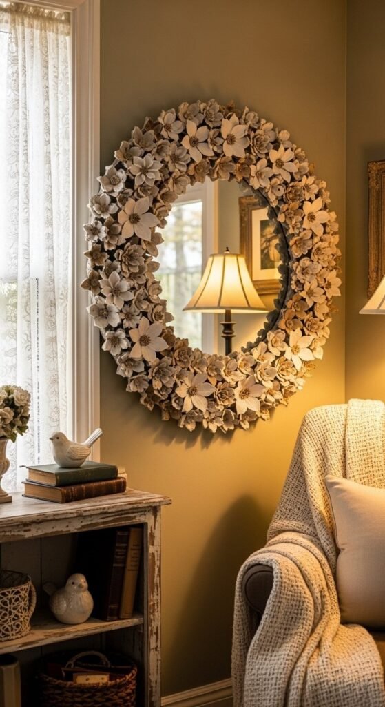 Egg cartons create lightweight sculptural flowers. Cut petals carefully and layer them for depth. Glue pieces onto cardboard backing, not the mirror itself. Paint once assembled for a cohesive look. Dry brushing adds dimension without heavy color. This frame fits cottage and romantic interiors. Keep color palettes neutral for balance. Seal with clear spray to protect the paper texture. Best used on small to medium mirrors.