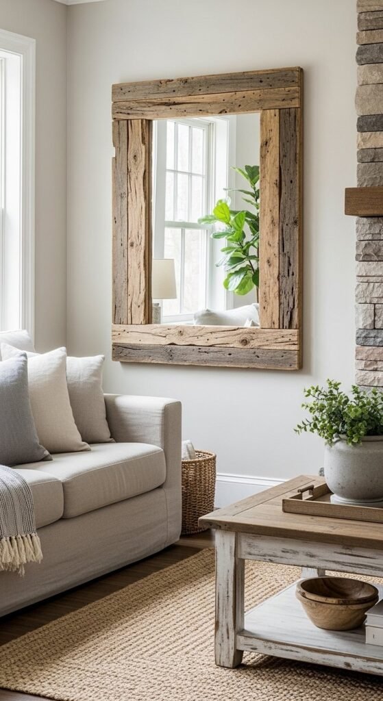 Pallet wood adds instant character. Sand lightly to remove splinters but keep grain visible. Cut boards evenly for clean corners. Wood glue and clamps help keep alignment steady. Natural imperfections add warmth, so avoid over-finishing. This frame pairs well with neutral walls and linen textures. Entryways and bathrooms handle this look well. Seal wood to prevent moisture damage. Keep the mirror size balanced so the frame doesn’t overpower it.
