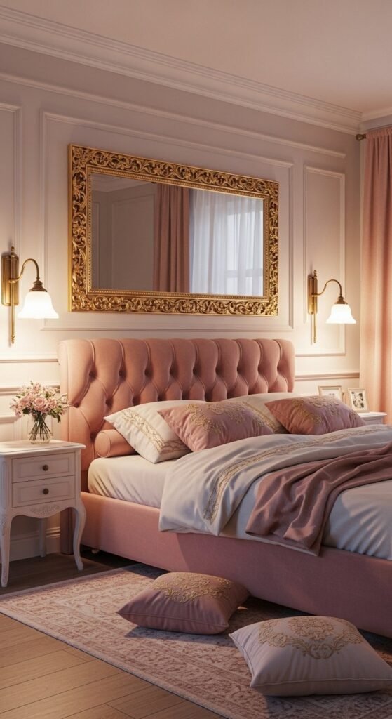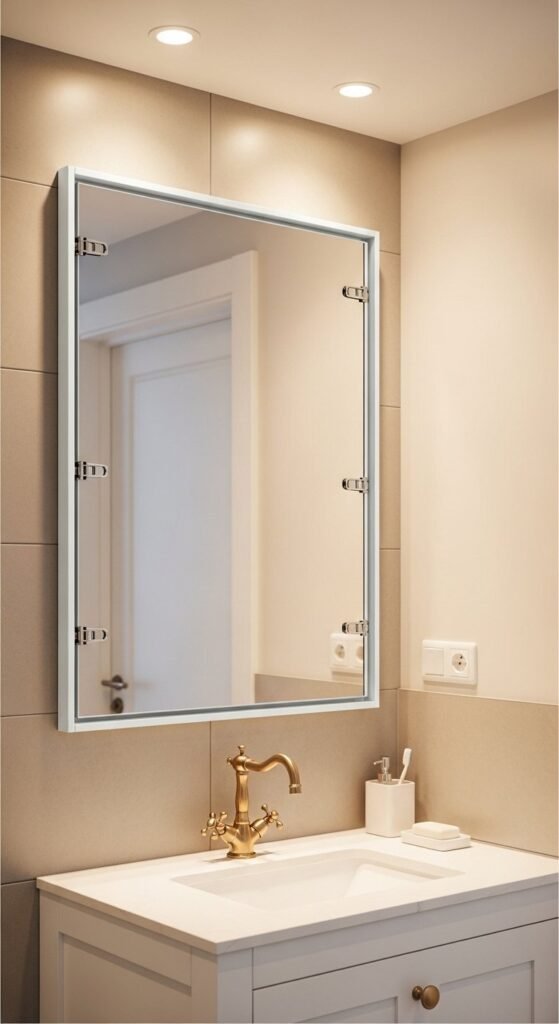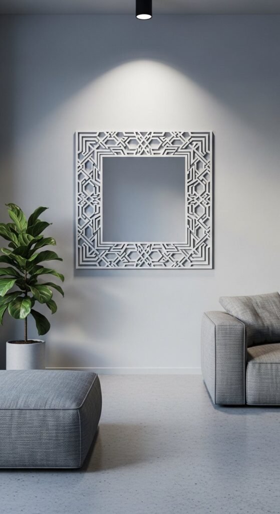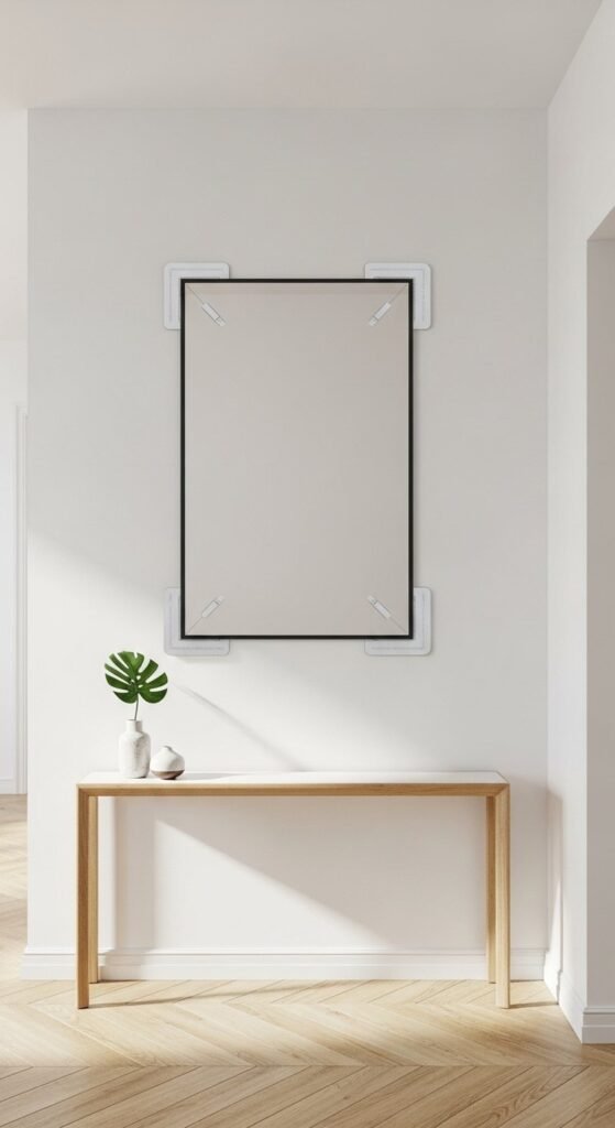 This approach works well where drilling isn’t allowed. Use lightweight trim or foam moulding to keep weight low. Assemble the frame off the wall, then attach using high-quality adhesive strips. Press firmly and let it rest before hanging. Weight limits matter, so check packaging carefully. This style suits small to medium mirrors. Neutral colors help it blend into rentals easily. Remove gently when moving out to avoid marks. Hallways and bedrooms handle this setup best.