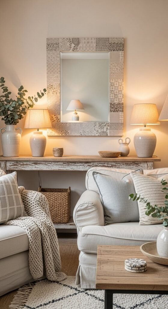 Mosaic mirrors bring sparkle without expensive materials. Craft mirrors or acrylic sheets are safer than real glass. Break pieces inside a cloth to control edges. Arrange patterns dry before gluing so spacing feels intentional. Epoxy or strong craft glue keeps tiles secure. Grout color changes the whole mood—white feels clean, charcoal feels bold. This mirror works as a focal piece, not background decor. Entryways and stair landings show it off best. Seal edges once finished so reflections stay sharp over time.