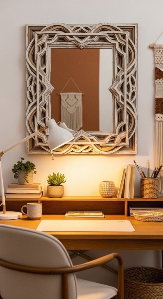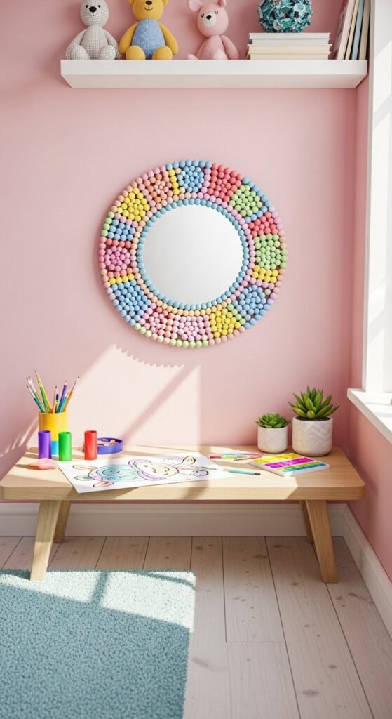 This mirror combines structure with softness. Craft sticks form the base, while beads add rhythm. Paint sticks before assembly for cleaner results. Glue beads last to control spacing. Repeating patterns keep it calm, even with mixed materials. Lightweight designs hang easily without anchors. This style works well above dressers or reading corners. Stick to warm wood tones or muted paint shades. Avoid overcrowding so the mirror surface stays visible.