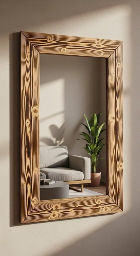 Charred wood adds contrast without heavy color. Lightly torch wood, then seal it once cooled. Keep burns shallow so texture stays visible. Pair with clean-lined mirrors for balance. Dark grain draws the eye inward, making the mirror feel grounded. This style works well in modern rustic or industrial rooms. Avoid high humidity areas unless fully sealed. Simple corners look better than ornate cuts here.