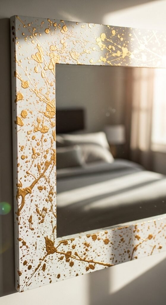 Splatter frames double as wall art and decor. Start with a plain frame or MDF trim glued around a frameless mirror. Protect the glass using painter’s tape and plastic wrap. Flick gold paint using a stiff brush or toothbrush for better control. Less paint gives cleaner results, so build layers slowly. This style pairs well with modern or eclectic rooms. Keep surrounding decor simple so the mirror stands out. If gold feels bold, try black on white or bronze on taupe. Let everything dry fully before removing tape to keep edges crisp.