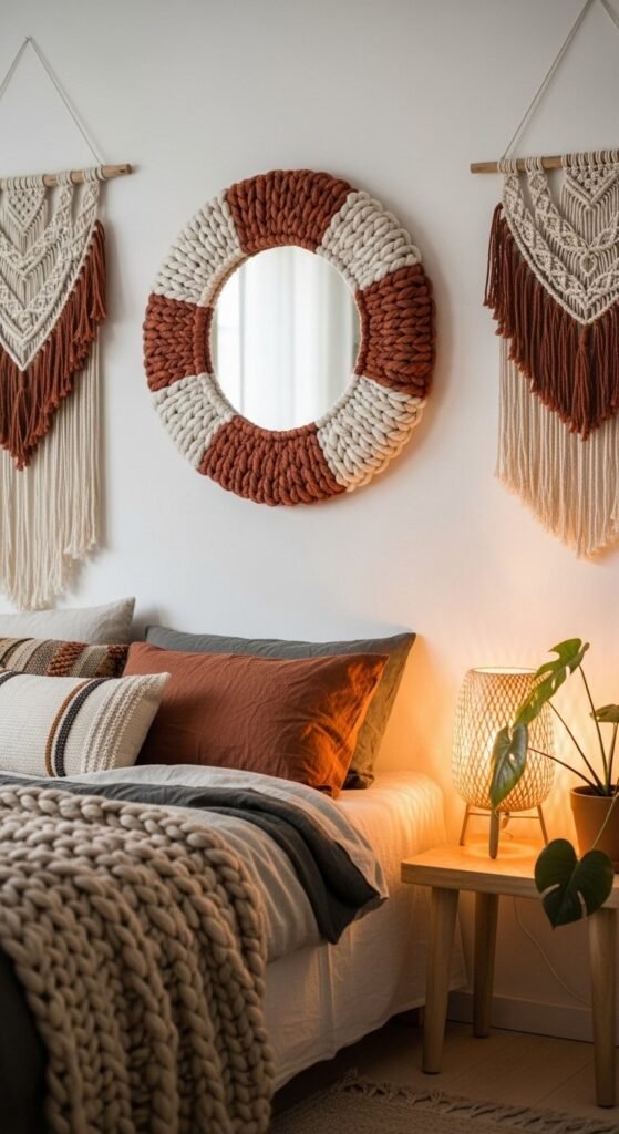 Yarn-wrapped mirrors feel soft and tactile. They work best with small to medium mirrors. Use hot glue in short sections so yarn stays tight. Neutral yarn keeps the look calm, while color blocking adds personality. Layering yarn thickness creates depth without tools. This style fits well in bedrooms, reading corners, or nurseries. Pair it with woven baskets or linen textiles. Avoid humid areas unless yarn is sealed. For extra detail, tuck beads or knots into the wrap pattern. Lightweight frames make hanging simple with basic hooks.
