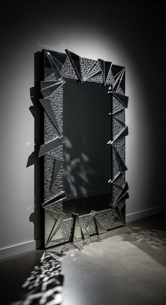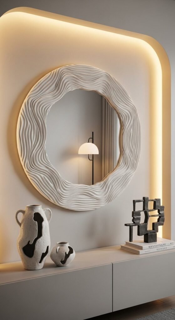 Sculptural frames blur the line between mirror and art. Use foam board, cardboard, or clay to build layers outward. Keep shapes intentional and spaced evenly. Paint in one tone so form stays dominant. Shadows create the drama, so directional lighting matters. This mirror works best as a solo piece. Entryways and feature walls suit it well. Keep nearby decor minimal so the structure stands out.