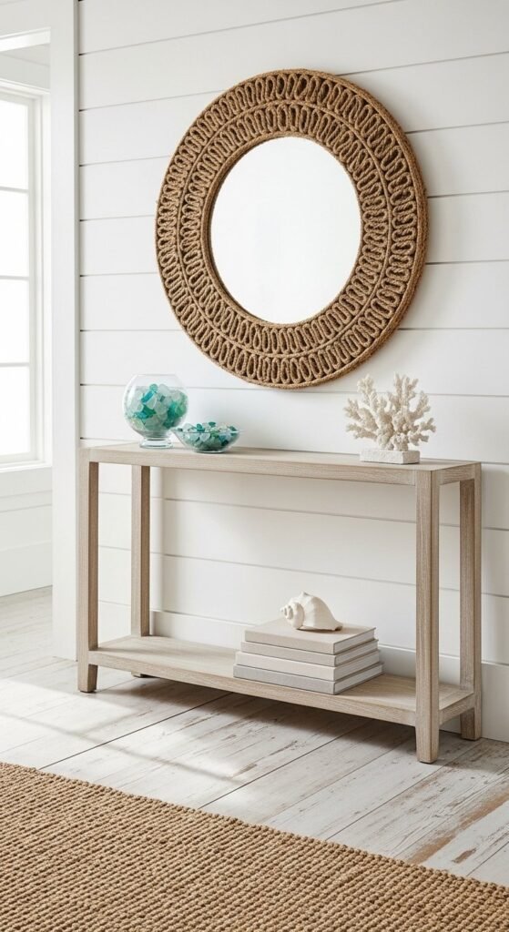 Rope frames bring texture without paint or tools. Sisal or jute rope works well and stays flexible. Start wrapping from the bottom so seams stay hidden. Hot glue in short sections to keep alignment tight. Natural rope softens reflective surfaces, making rooms feel calmer. This style pairs nicely with light walls and woven accents. Entryways and bathrooms benefit most from the coastal look. Avoid placing near direct moisture unless sealed. If full rope feels heavy, try alternating rope and wood beads for variation.