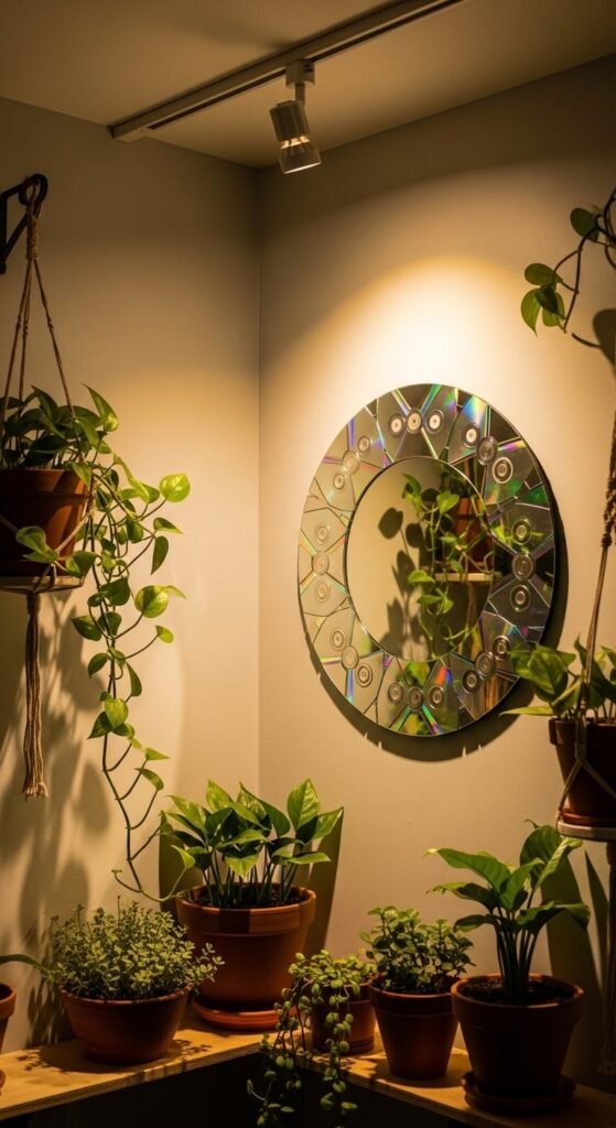 Old CDs add shine without added cost. Cut pieces carefully using scissors and protective gloves. Arrange fragments face-up for reflective sparkle. Strong craft glue holds lightweight plastic securely. Angle pieces slightly to catch light throughout the day. This frame suits small mirrors and art walls. Use dark grout to sharpen contrast. Keep surrounding decor simple so reflections stay readable. This project fits creative rooms and teen spaces well.