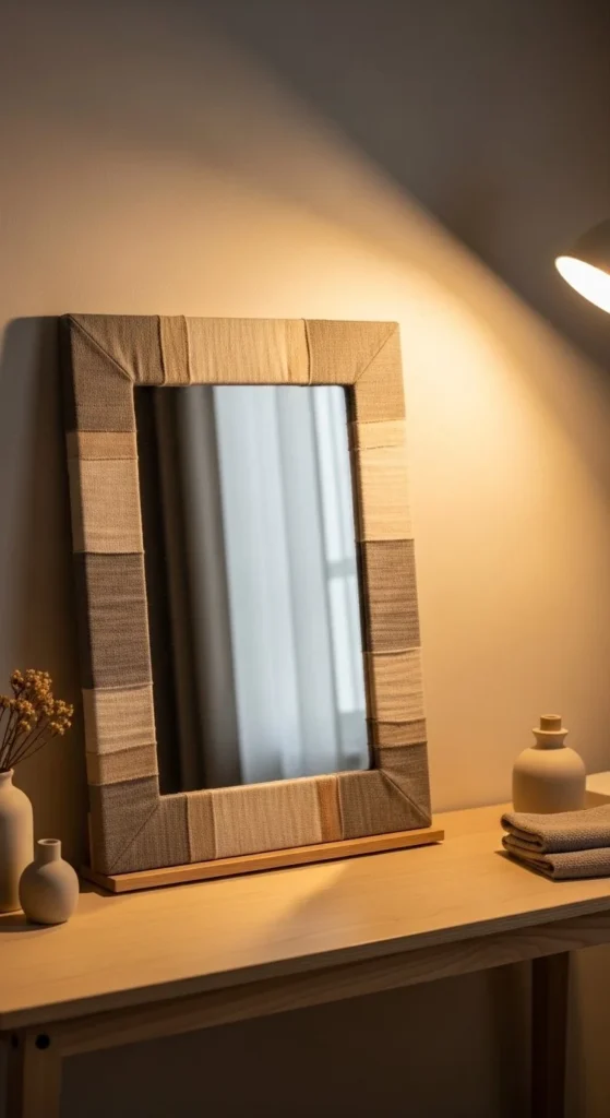 Fabric frames soften hard surfaces. Use thin plywood or MDF as a base. Wrap tightly and staple on the back. Linen, canvas, or patterned cotton work well. This idea fits bedrooms or dressing areas better than bathrooms unless sealed well. Textile detail adds warmth and personality. The budget depends on fabric choice but can stay under $30.
