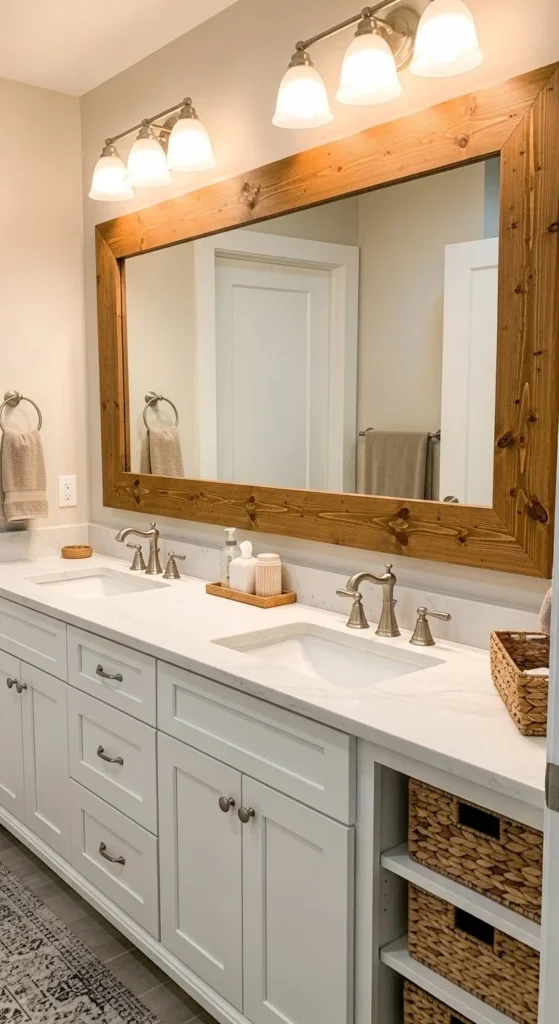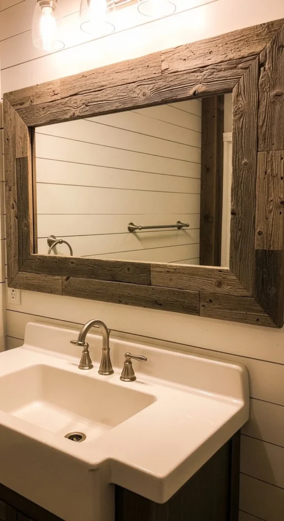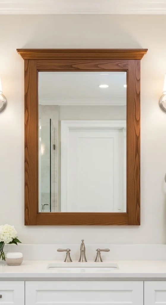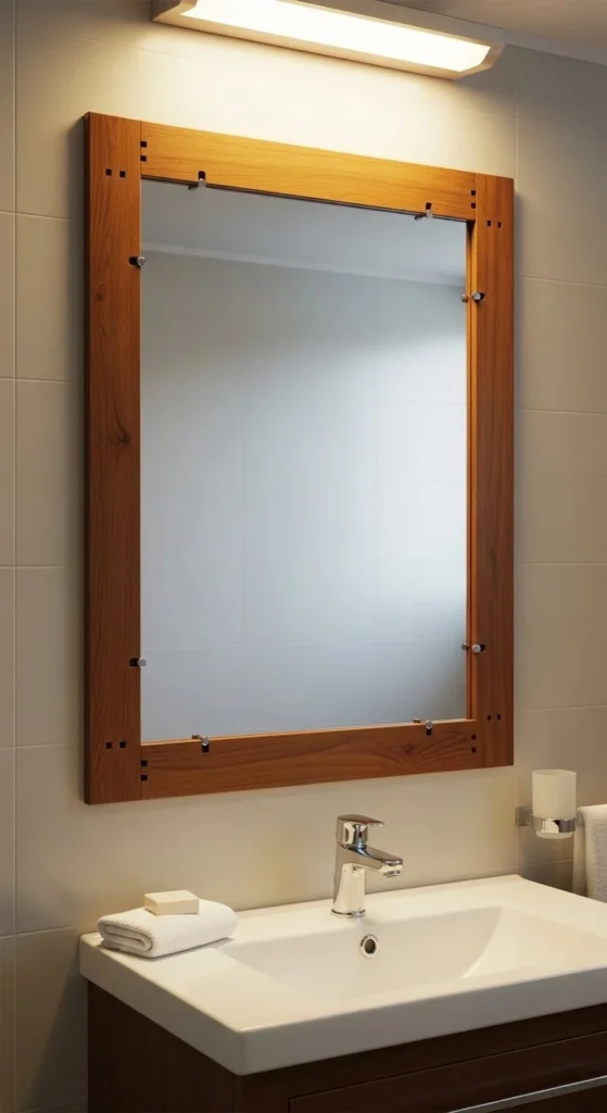 Wide planks create presence. Use 1×6 or 1×8 boards for bold edges. This style balances large mirrors well. Sand corners smooth to avoid sharp lines. Medium stains feel warm without going dark. Secure joints on the back with corner braces. Bold farmhouse framing works best in spacious bathrooms. Total spend usually falls around $30–$45.