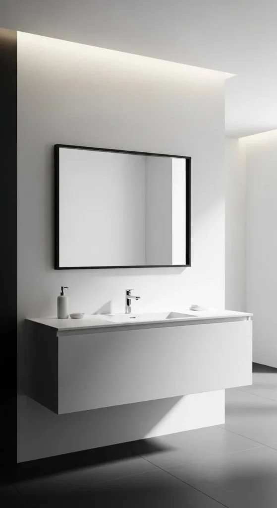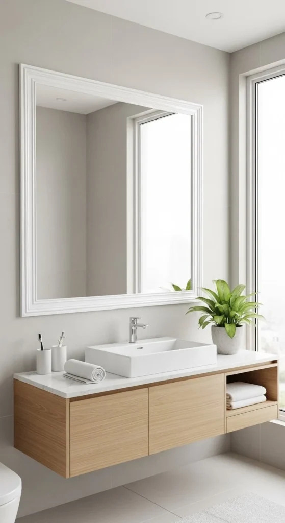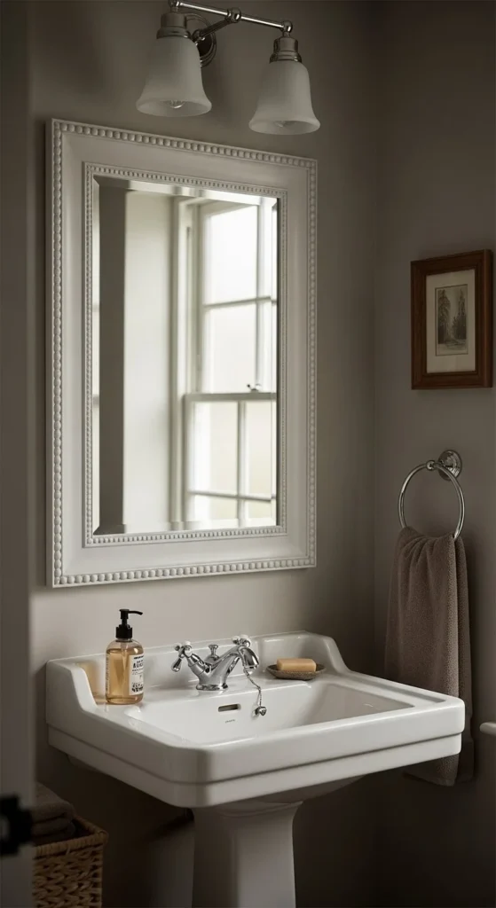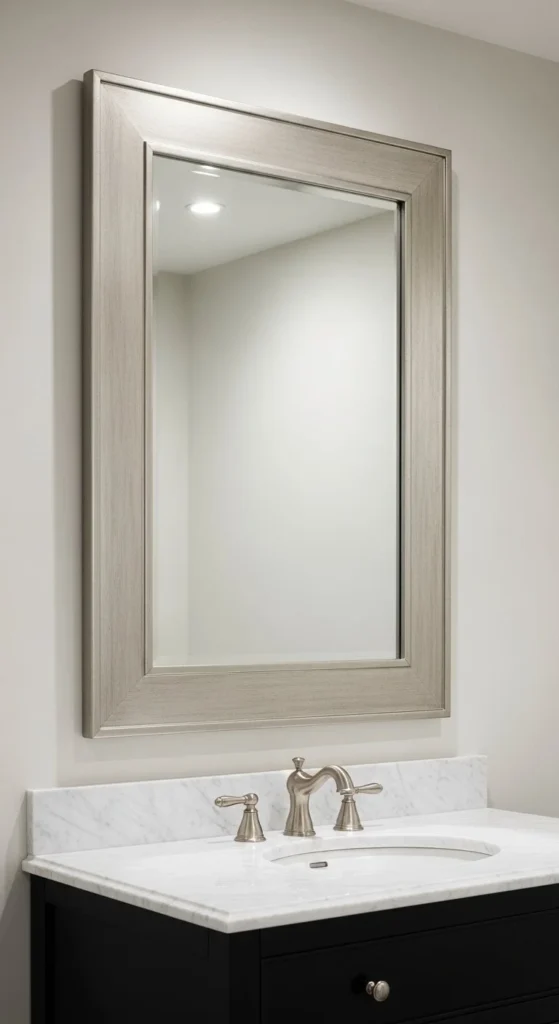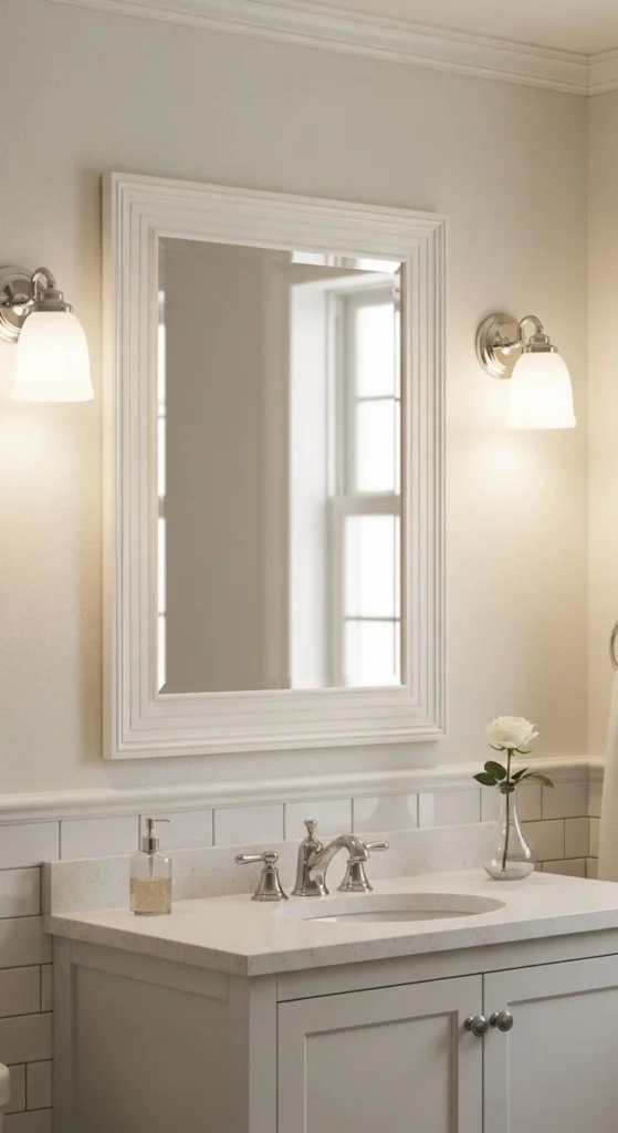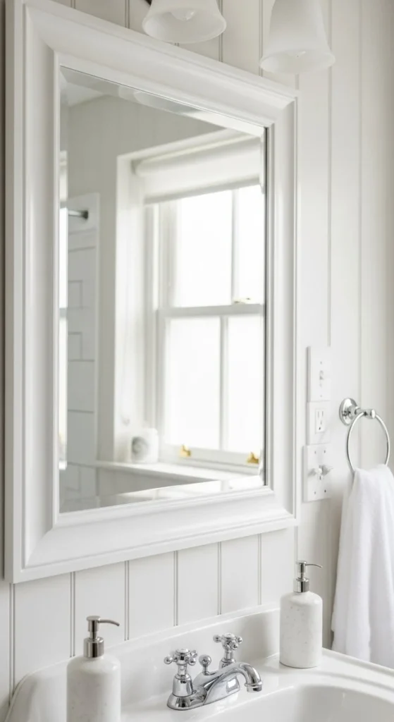 White frames keep things light. Use primer to avoid bleed-through. Semi-gloss paint handles moisture better. Keep trim profile simple. This approach refreshes older bathrooms fast. Adhesive mounting keeps walls intact. Clean painted finishes suit traditional or coastal homes. Costs stay low, often under $25.
