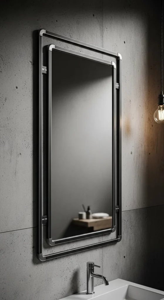Metal-look frames can be faux. Use painted wood or PVC trim. Dark gray or charcoal paint mimics steel. Keep edges straight and corners tight. Pair with exposed bulbs or black fixtures. Industrial contrast gives builder mirrors an edge. Budget ranges from $20–$35.