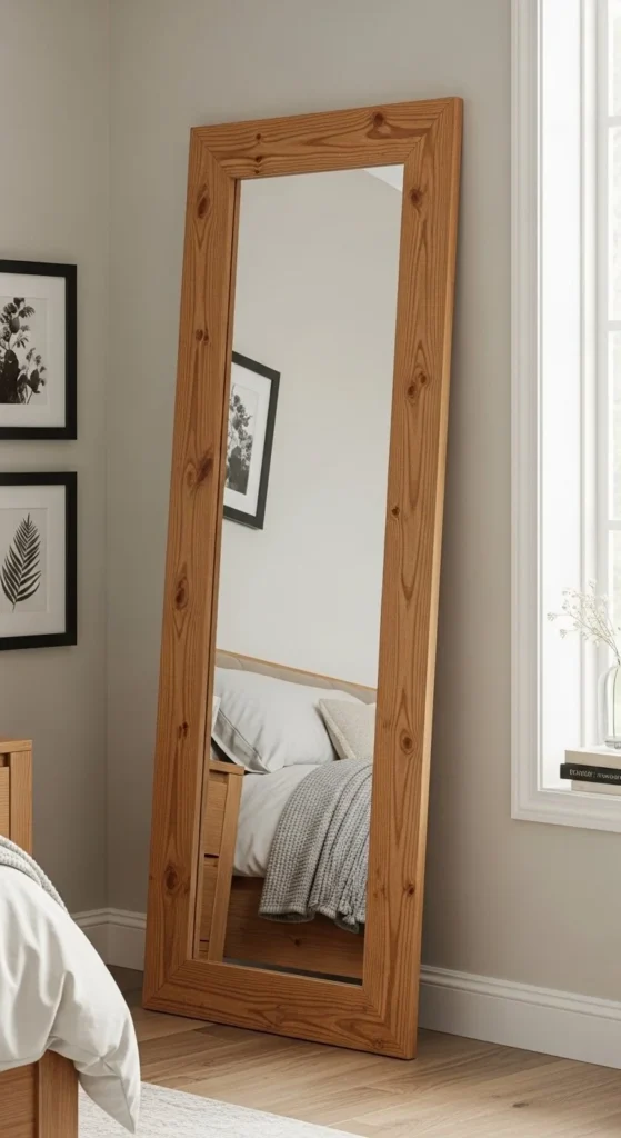 Floor mirrors feel custom with wood frames. Use plywood backing for stability. Secure corners firmly. Leave wood natural or lightly stained. This project suits bedrooms and closets. Simple structure with big impact. Costs vary by size but often stay under $50.