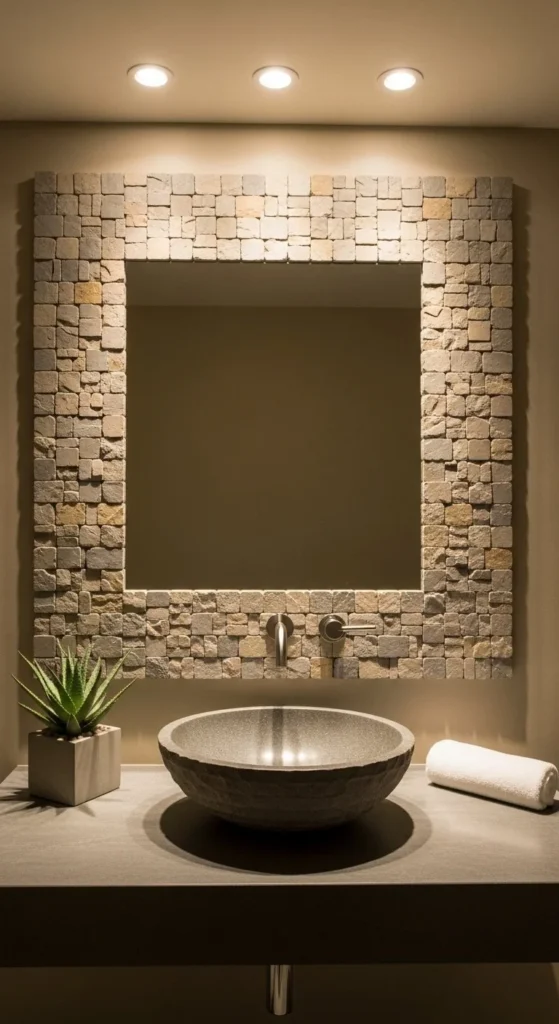 Tile adds texture and shine. Use mesh-backed tiles for easier install. Apply mirror-safe adhesive. Grout lightly and seal well. This style works best in bathrooms. Textured tile borders catch light and feel high-end. Material cost usually sits between $30–$50.