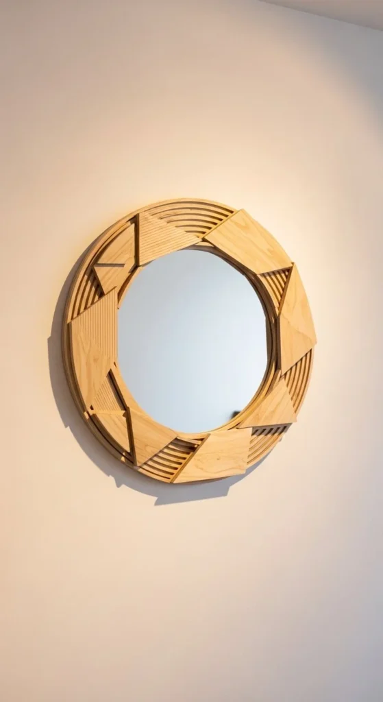 Geometric overlays bring visual interest. Cut triangles, hexagons, or abstract shapes from thin plywood. Attach to a backing board around the mirror. Stain or paint for contrast. DIY modern art frame works in bedrooms, offices, or living rooms. Lightweight and under $30 if you use scrap plywood. No power tools are necessary if pre-cut shapes are available.