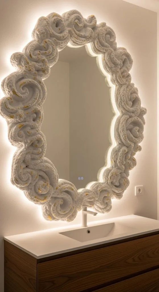 Expanding foam can create one-of-a-kind shapes. Spray directly around mirror edges or onto a base. Carve shapes after curing. Paint or metallic finish highlights texture. Sculptural statement framing is budget-friendly and lightweight. Works well in powder rooms or creative spaces. Costs stay under $25, using minimal materials.