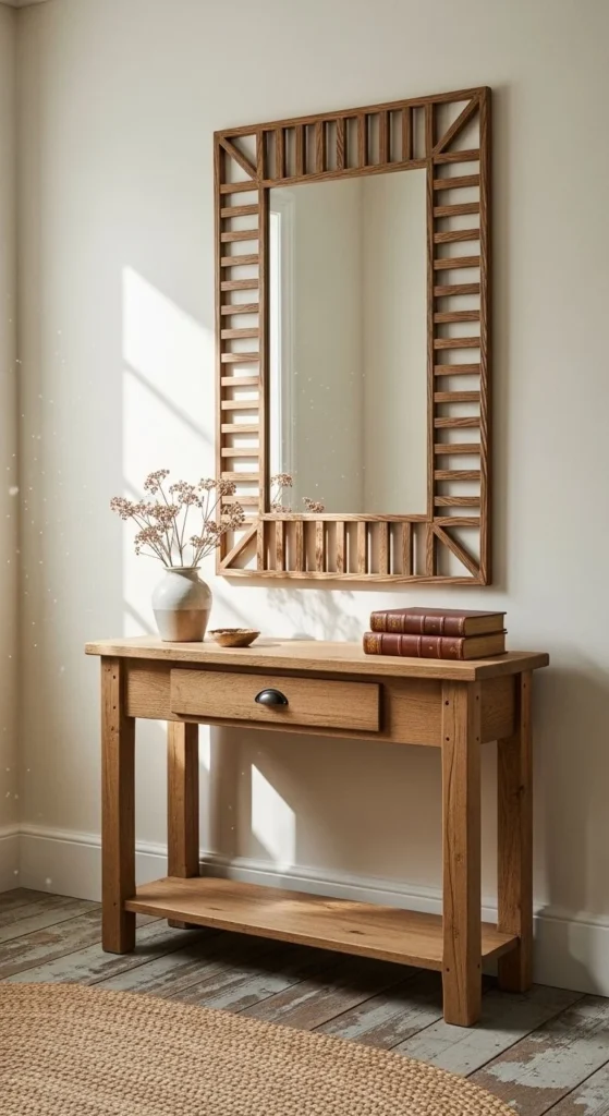 Pallet wood brings raw texture. Break boards down carefully and sand splinters. Keep natural flaws visible. Mix plank widths for depth. Stain lightly or leave bare. Secure joints with corner braces on the back. This works well for entryways and mudrooms. Upcycled materials keep costs low, often under $15. Seal the wood to prevent dust and moisture issues.