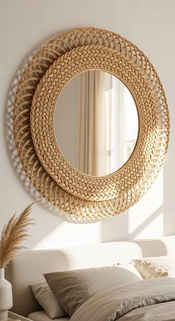 Rattan frames feel airy and lightweight. Choose pre-made rattan circles or weave your own over a thin wood backing. Hot glue or tack the ends securely. Textural natural framing works beautifully in bedrooms or living spaces. Low cost, usually under $30. Pair with soft linens or neutral wall colors to highlight the organic material.