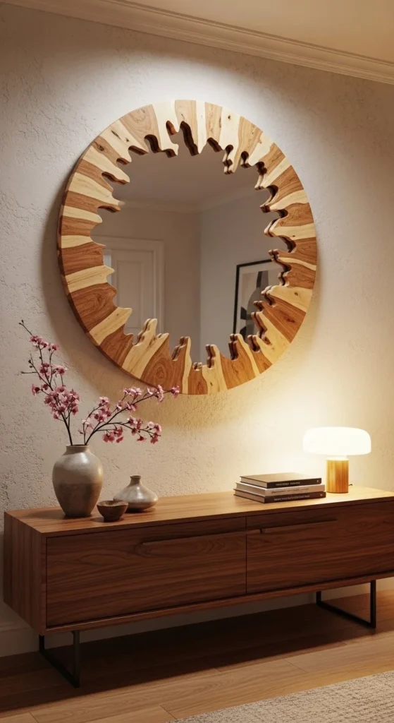 Cut unique, flowing shapes from plywood or thin wood with a jigsaw. Sand edges smooth. Arrange pieces around the mirror, overlapping for visual interest. Handcrafted organic frames create a one-of-a-kind centerpiece. Works in living rooms, bedrooms, or offices. Budget-friendly using scrap wood, often under $30. Paint or stain optional depending on your desired look.