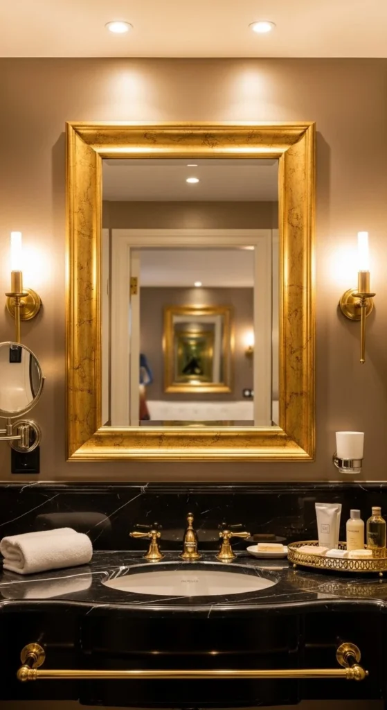 Transform inexpensive wood with metallic spray paint. Choose silver, gold, or bronze for a luxe effect. Sand lightly before painting for smooth adhesion. Affordable glam framing is perfect for powder rooms or small bathrooms. Protect with clear sealant for longevity. Total spend around $20–$30. Works with both modern and transitional decor.