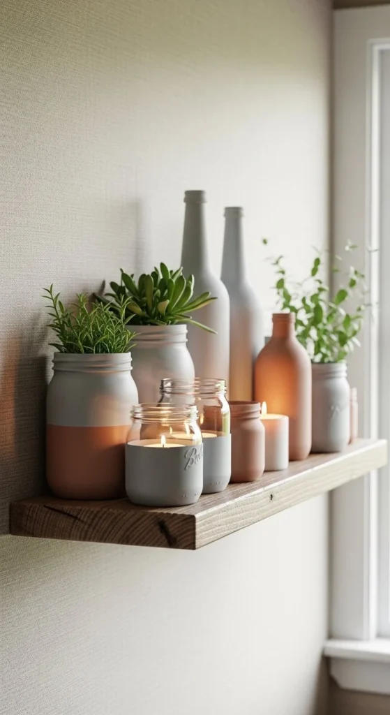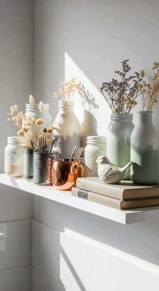 Upcycling everyday jars gives your shelf personality. Paint mismatched bottles in one tone to unify them. Add small plants or tea lights. Upcycling ideas for older decor help reduce waste and save money.