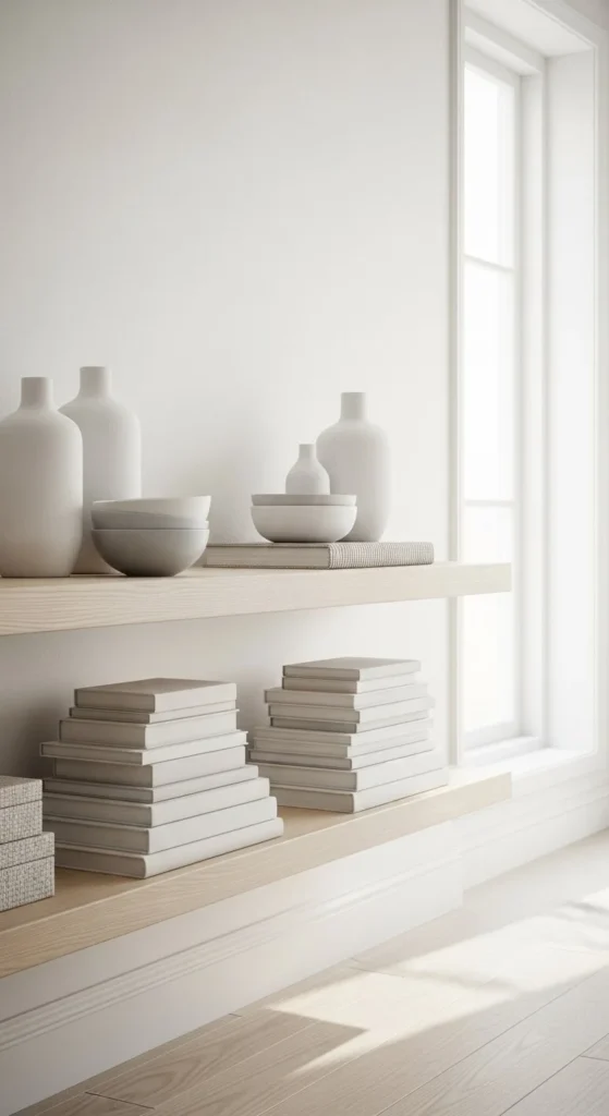 This look favors calm and restraint. Light wood shelves blend into pale walls. Decor stays simple. Think smooth ceramics, plain books, and one subtle object with texture.