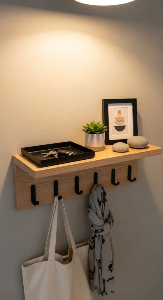 DIY trick: add hooks underneath the shelf for bags or hats. Paint hardware to match shelf brackets for cohesion. Functional decor keeps clutter off surfaces while still looking considered.