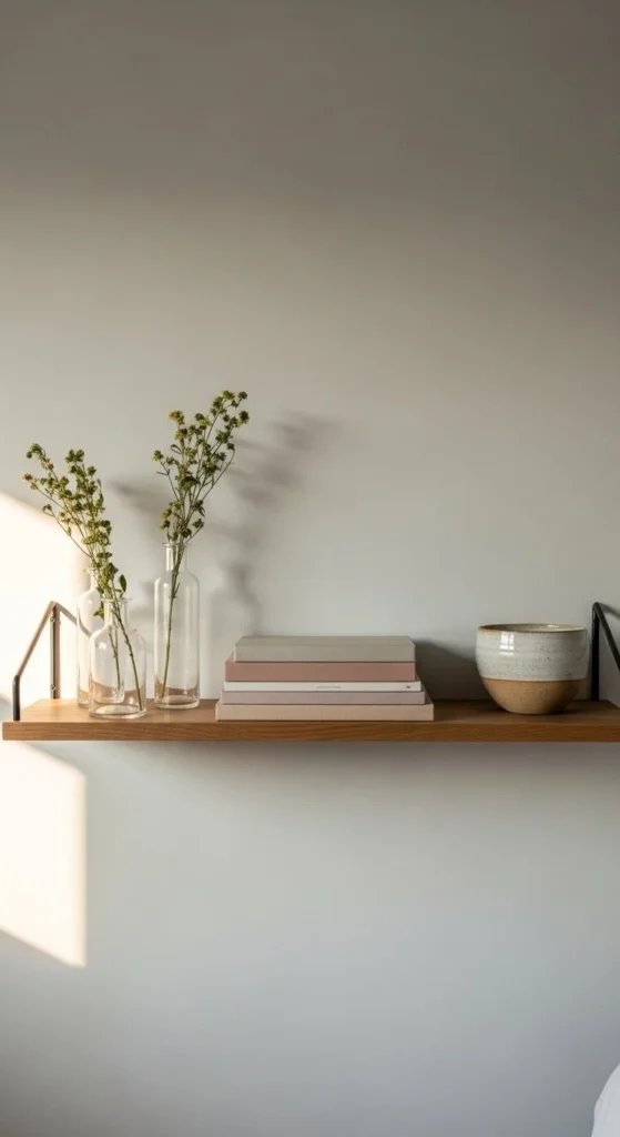 DIY tip: sand shelves extra smooth and use a clear finish only. Let the wood grain show. Minimal shelf styling works best when each item earns its place.