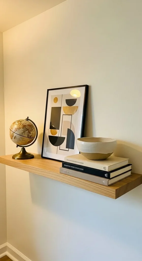 This idea works well in hallways, above consoles, or between windows. It’s also renter-friendly. One anchor screw can hold a lightweight shelf. Rotate the object seasonally. The shelf stays. The mood shifts.